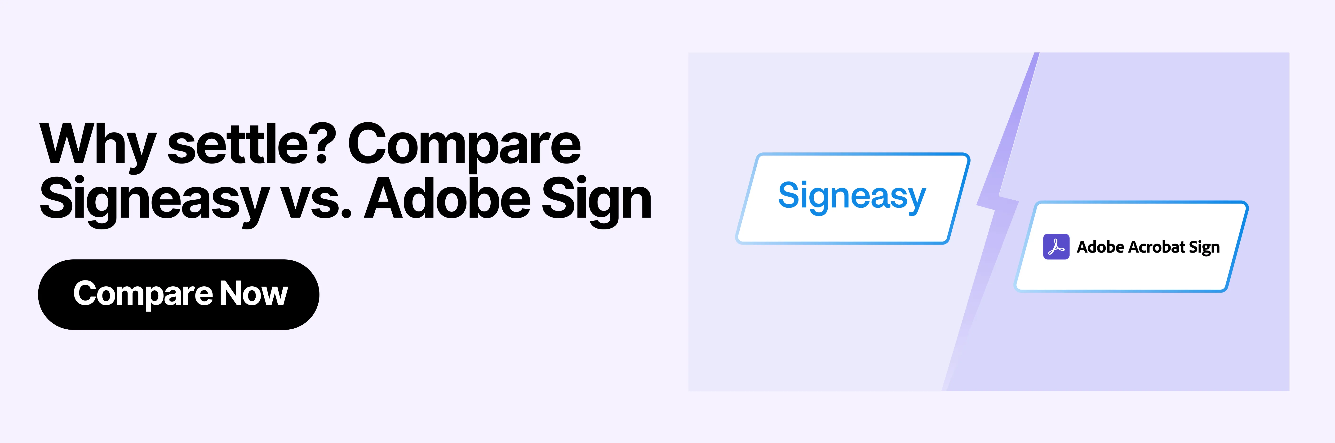 Signeasy checks all the boxes when choosing the top contender among alternatives to Adobe Sign. It’s a cost-effective, user-friendly, and feature-rich solution with reliable customer support. Sign up for a 14-day free trial or book a demo today to see how Signeasy is the partner you’re looking for.