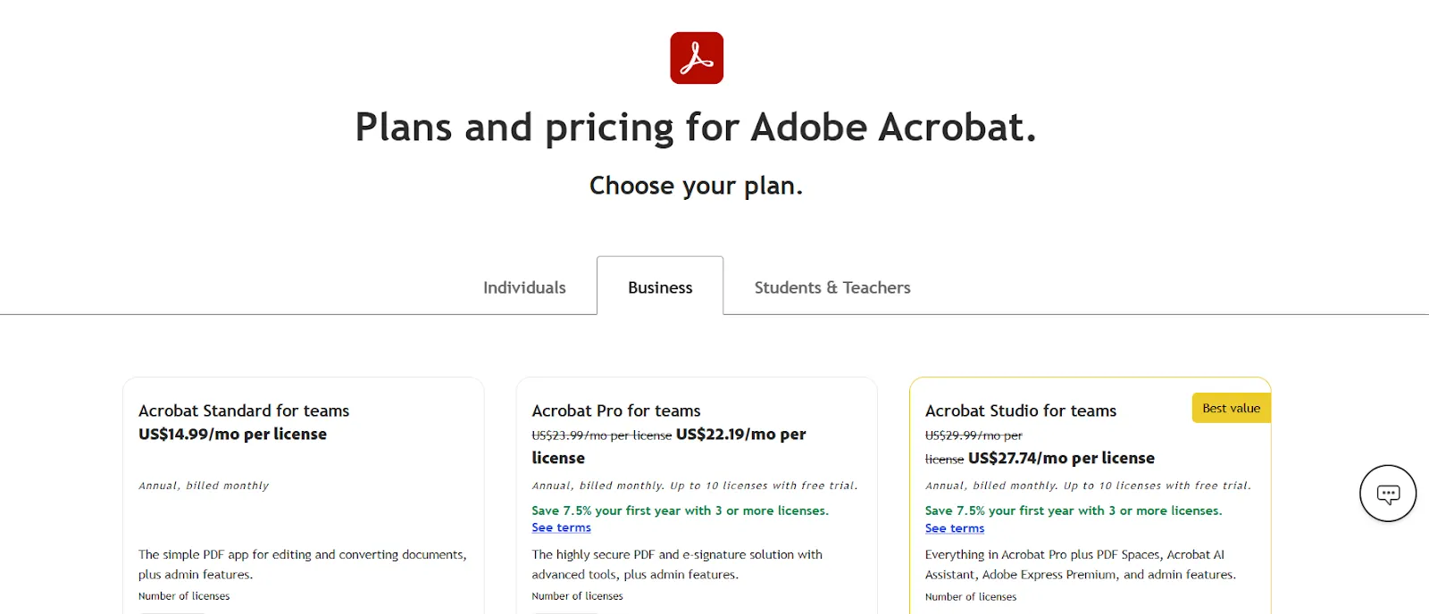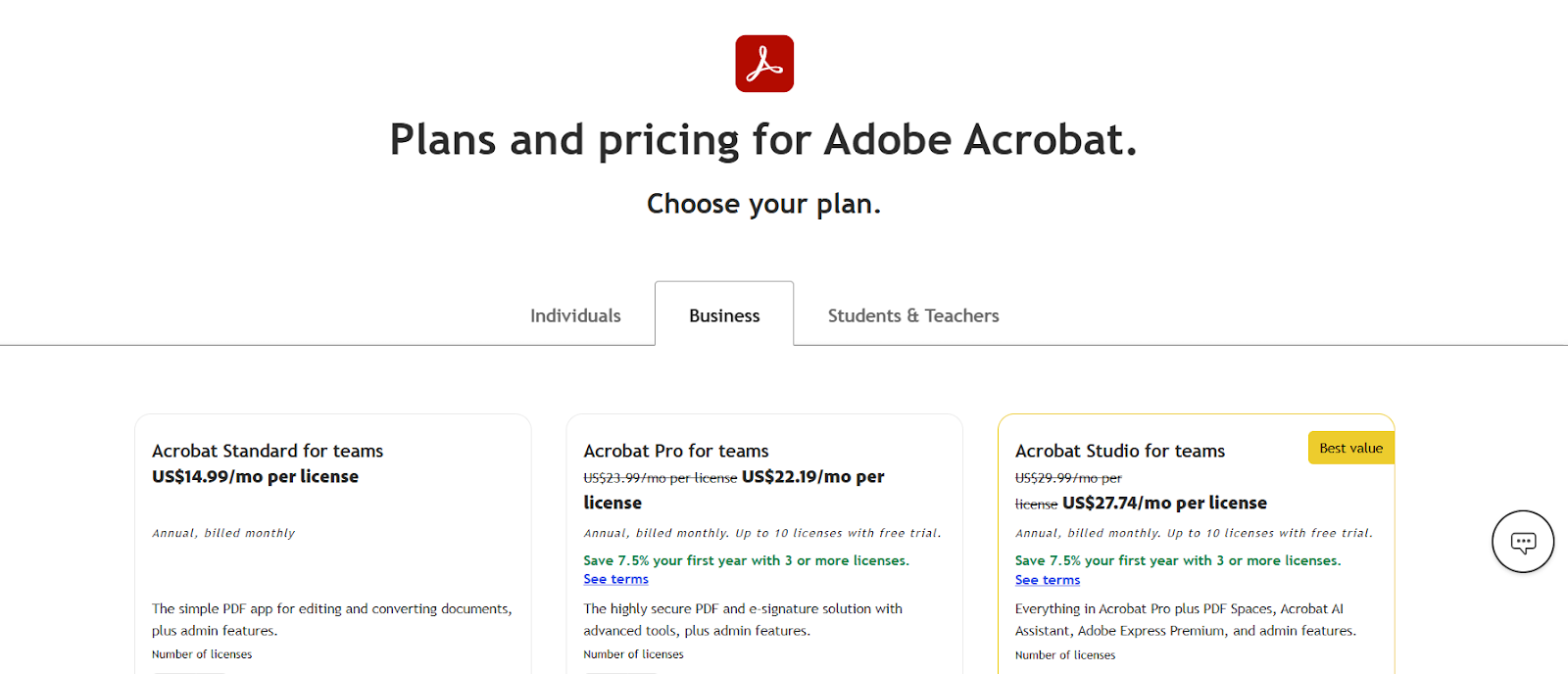 Adobe Acrobat Sign structures its pricing for Individuals, Students & Teachers, and Businesses. For contract management teams, the relevant options are the business tiers.