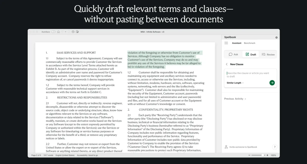 The technology uses natural language processing to understand contract language, compare terms against your playbook, and highlight clauses that need attention. AI learns from your previous reviews, becoming more accurate at spotting problematic clauses and suggesting redlines that match your preferences.