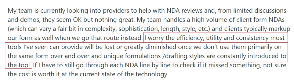 As one corporate attorney noted: "I worry the efficiency will be lost once we don't use them primarily on the same form over and over and unique formulations are constantly introduced."