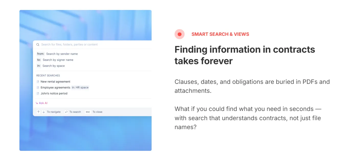 - Smart Search & Views understand contract context, not just file names — find clauses, dates, and obligations in seconds