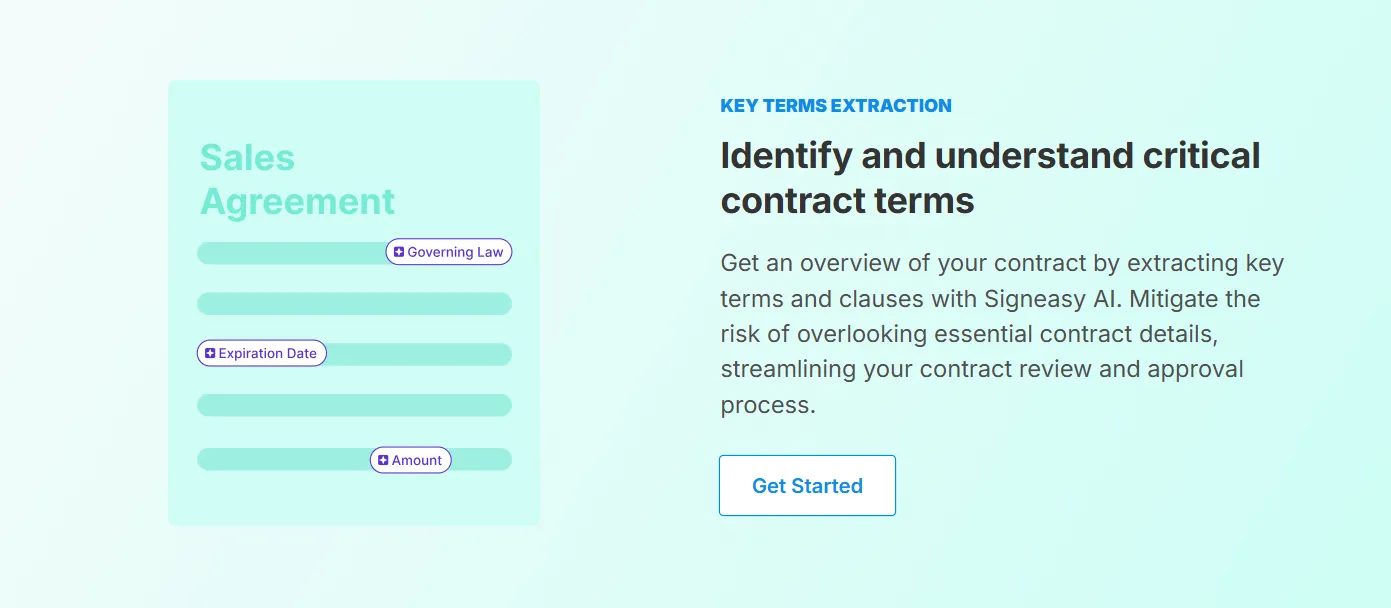 For example, Signeasy streamlines pre-signature review by identifying critical clauses through key terms extraction and condensing lengthy agreements into digestible AI summaries. Smart Q&A features also let teams ask questions and get instant answers about contract content before signing.