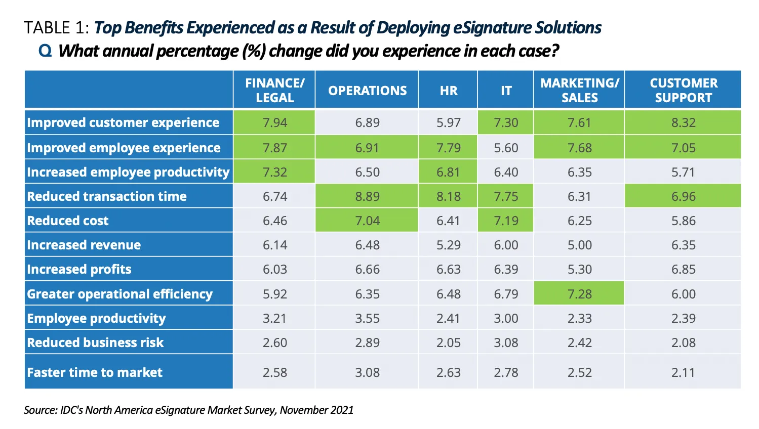 Small and midsize organizations saw an average 7% annual improvement in customer experience, transaction time, time to market, and operational efficiencies (source: IDC’s North America eSignature Market Survey, November 2021). This improvement was seen across sales, IT, HR, and Operations departments.