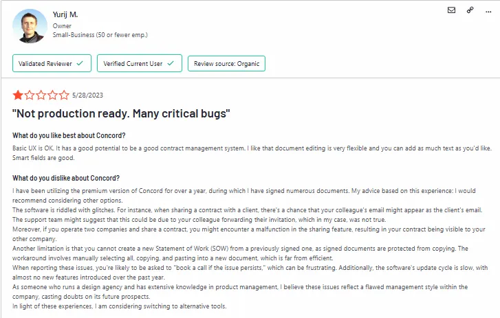 “The software's update cycle is slow, with almost no new features introduced over the past year. As someone who runs a design agency and has extensive knowledge in product management, I believe these issues reflect a flawed management style within the company, casting doubts on its future prospects. In light of these experiences, I am considering switching to alternative tools.”- Concord review on G2