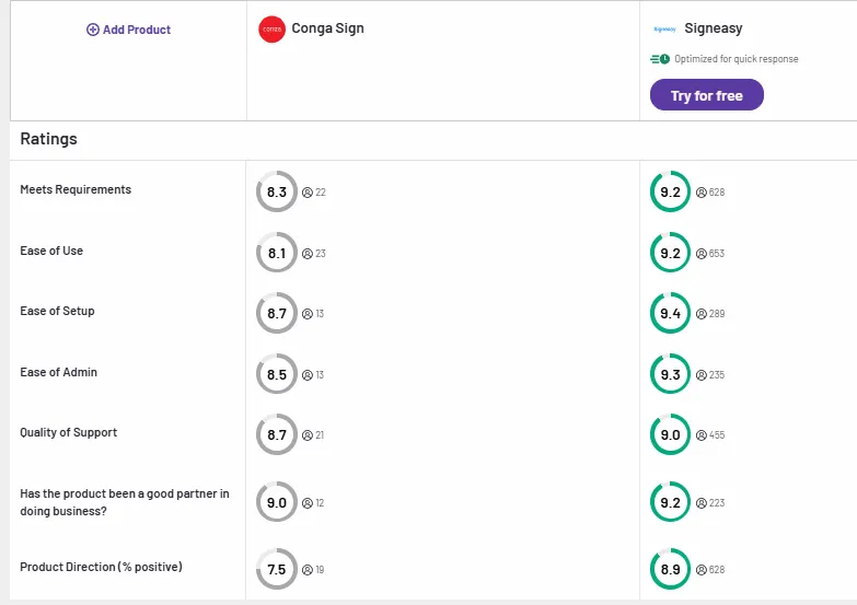 Here’s a side by side comparison of Signeasy vs Conga Sign on G2: