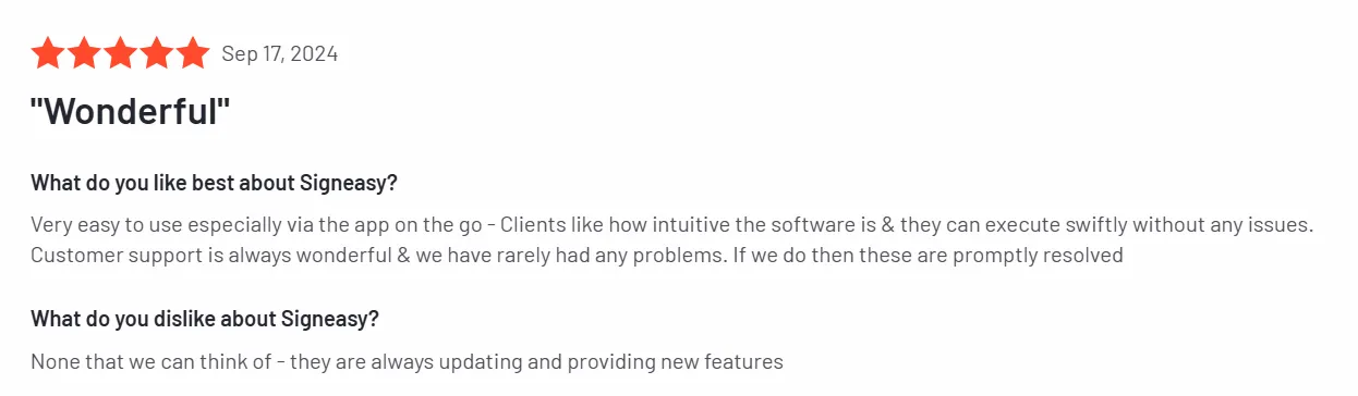 Signeasy’s customer support is available across all pricing tiers, so you don’t need to splurge on premium plans to get help. Our support team is known for being quick to resolve issues, ensuring your workflows stay smooth. This makes it especially appealing for small to mid-sized businesses, where every moment of downtime counts.