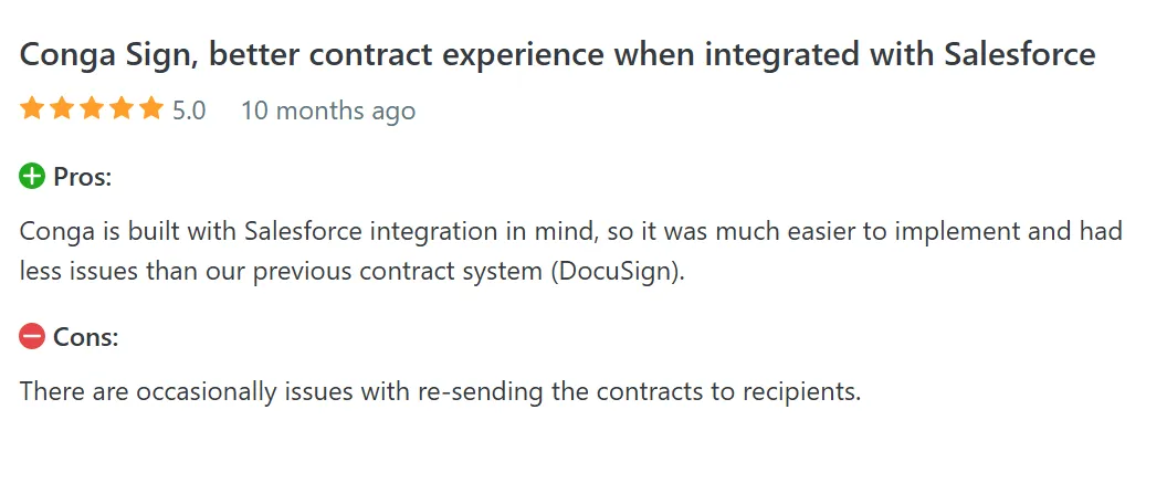 Most Conga Sign users talk about Salesforce integration in the reviews. There is little to no clarity on pricing plans, plus the features are divided into different products, raising the risk of additional costs for adding any feature. So, if you are looking for a complete contract lifecycle solution available with straightforward pricing plans, there are better alternatives.