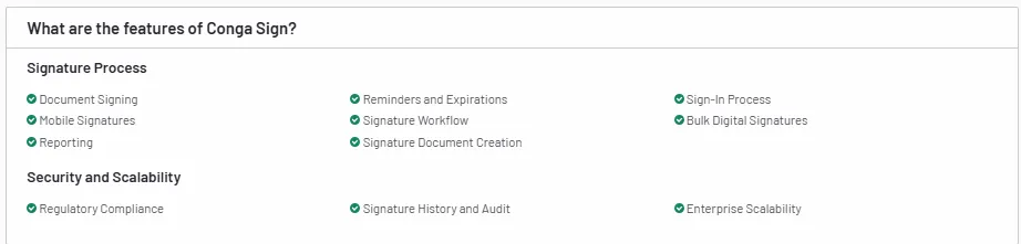 Although Conga Sign doesn’t have a dedicated pricing plans page or a detailed breakdown of what each plan includes, it does provide a separate features page where you can explore the capabilities it offers. This makes it easier for businesses to understand how Conga Sign can fit into their document management and signing workflows.