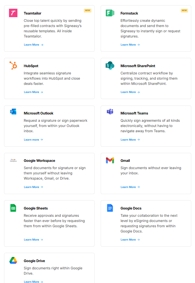 Automation only works when it fits into existing workflows. Through the Integrations Hub, Signeasy connects seamlessly with everyday tools such as: