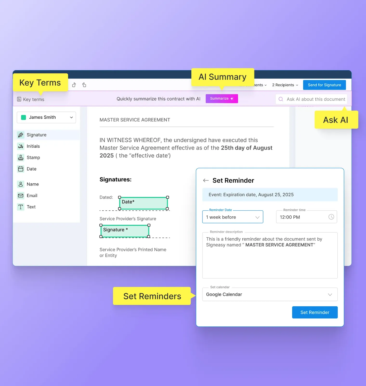 - Enable alerts for renewals, expirations, and obligations: Set automated reminders for critical dates like renewals or signing deadlines. In Signeasy, you can send auto-reminders to signers (e.g., on Day 1 and Day 7) to accelerate completion and follow-up