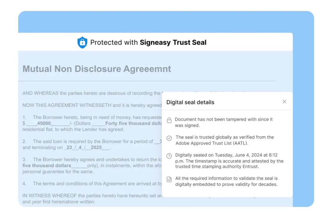- Signature ID and trust seal: Every signature includes a unique ID and verified seal to ensure authenticity and prevent tampering