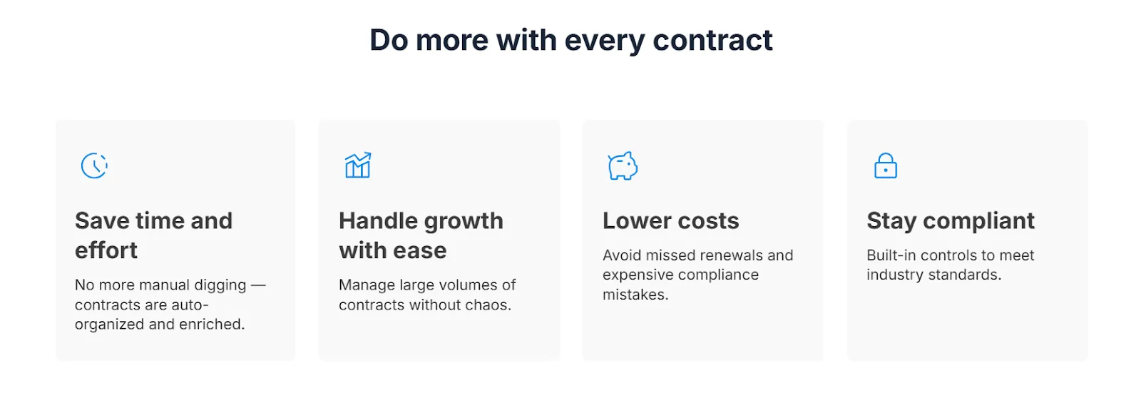 - Contracts live in a single, structured system that teams trust as the source of truth