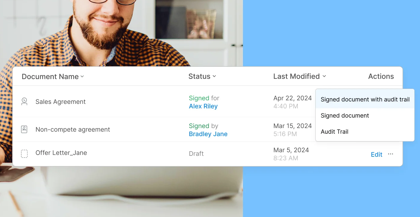 Integration with eSignature tools maintains complete signing audit trails from first draft through executed agreement and subsequent amendments.