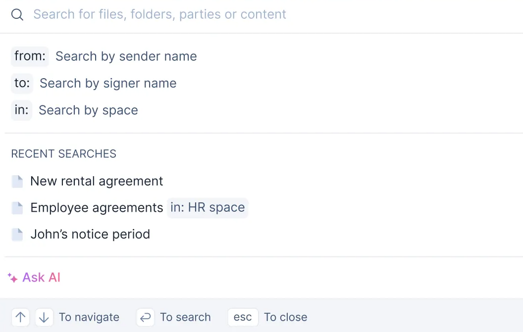 File name searches don't work when you need a specific termination clause buried in 50 pages of legalese. With Signeasy's Smart Search and Views, users find specific clauses, dates, and obligations in seconds using search that understands contracts.
