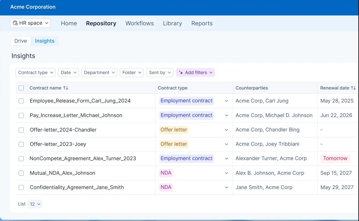A good repository pulls every agreement into one system where anyone with the right permissions can find what they need. Upload a vendor contract, and the system sorts it by type, department, counterparty, and status automatically.