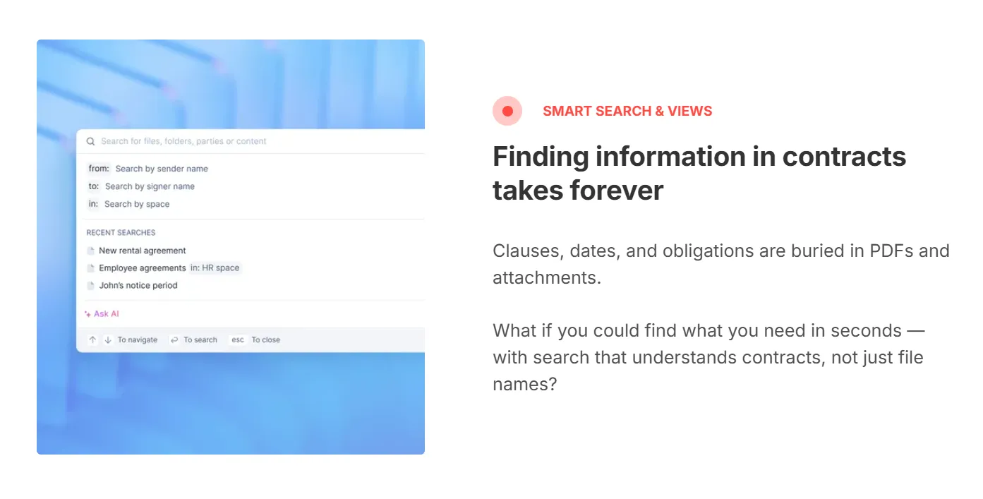 Platforms like Signeasy automatically identify document type, extract party names, pull key dates, and categorize everything without anyone creating folders or typing metadata. The system reads contracts the way a person would, then files them accordingly.