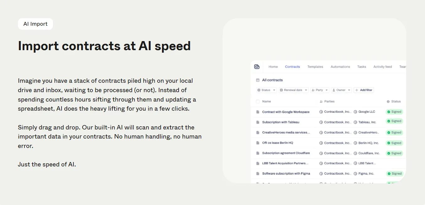 Contractbook's AI Import scans uploaded contracts and extracts key details like parties, dates, and payment terms automatically. Drag and drop files, and the system turns static PDFs into searchable records without manual entry.