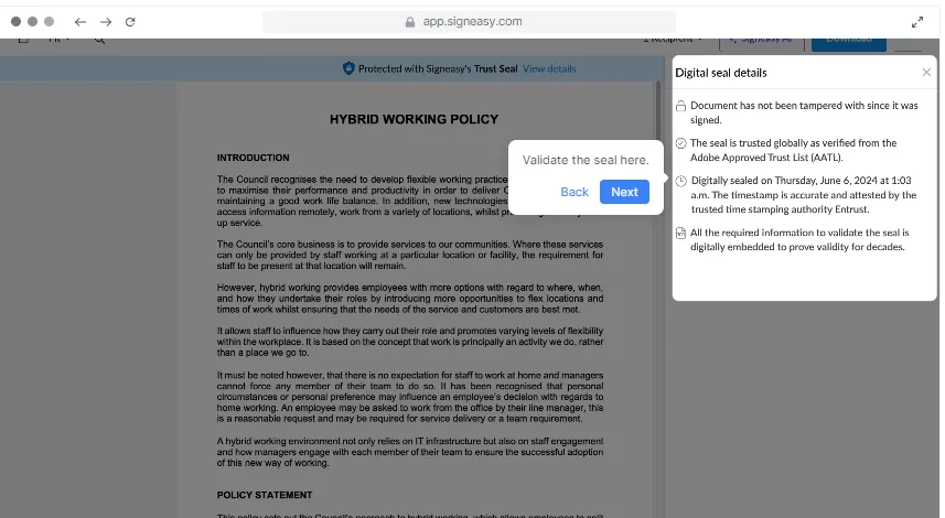Signeasy partners with Entrust, a leading certificate authority, to provide its digital signature solution. Entrust's trusted certificates ensure that each digital signature is verified and secure, adding another layer of reliability to the Trust Seal feature. This makes Signeasy’s digital signature technology not just secure but also backed by industry-recognized expertise, giving users confidence that their documents meet the highest security and compliance standards.
