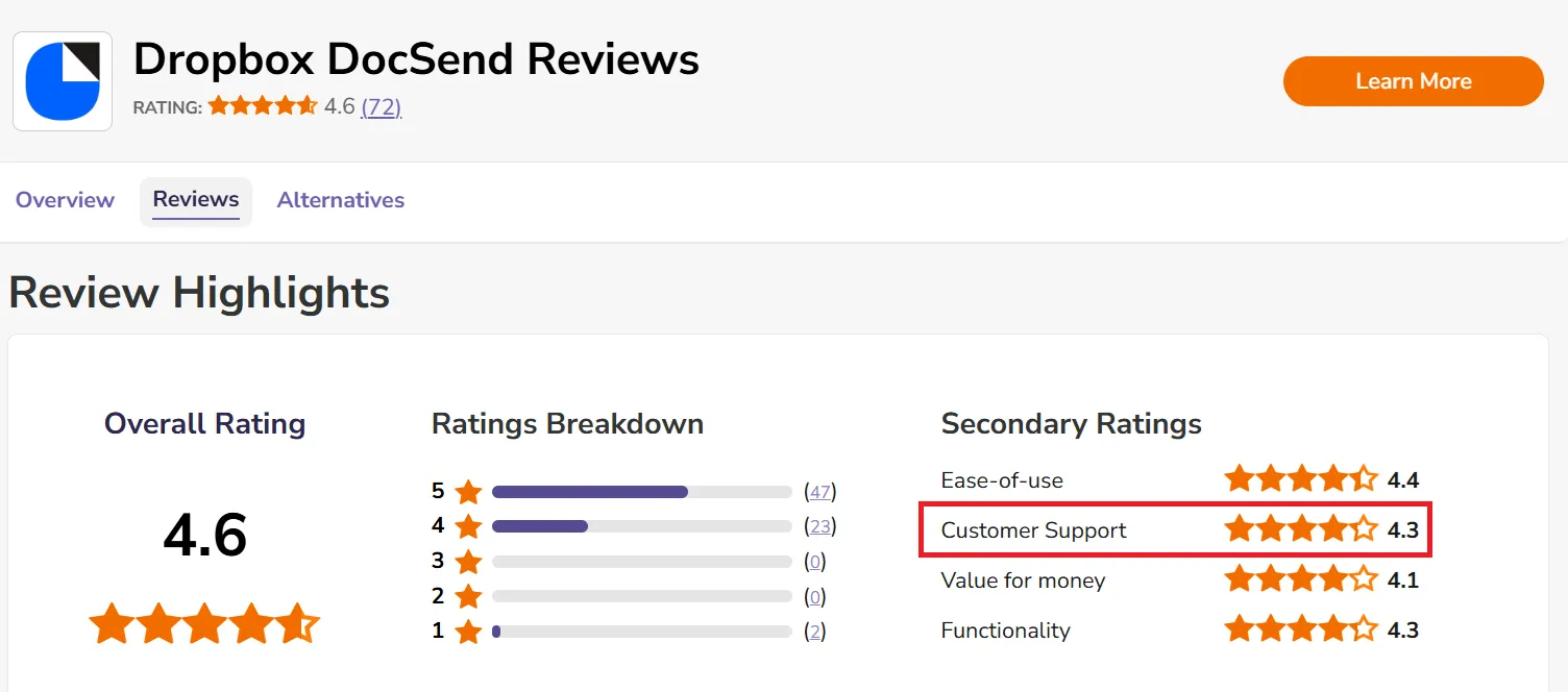 According to user reviews on multiple platforms like Gartner, GetApp, and Software Advice, DocSend's customer support is mostly good. It has a rating of 4 and above for Customer Support on most review platforms.