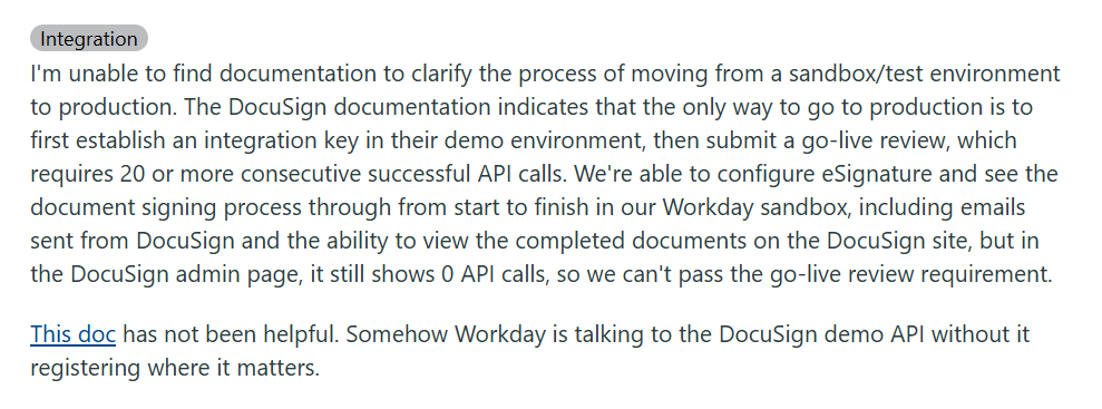 A Workday user described successfully configuring their integration and watching documents flow through the signing process, only to have an extra "review document" step appear afterward with text they couldn't edit or suppress.
