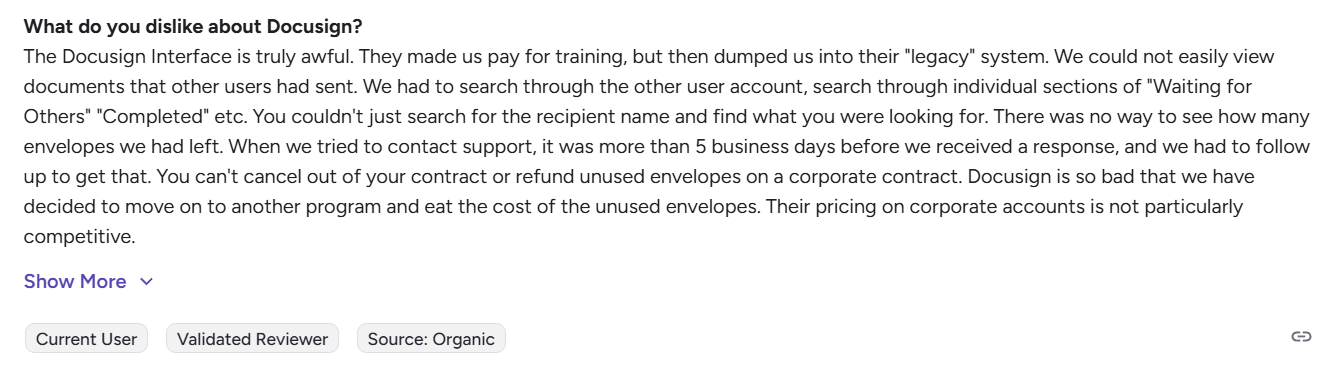 Docusign reviews reveal recurring frustrations.