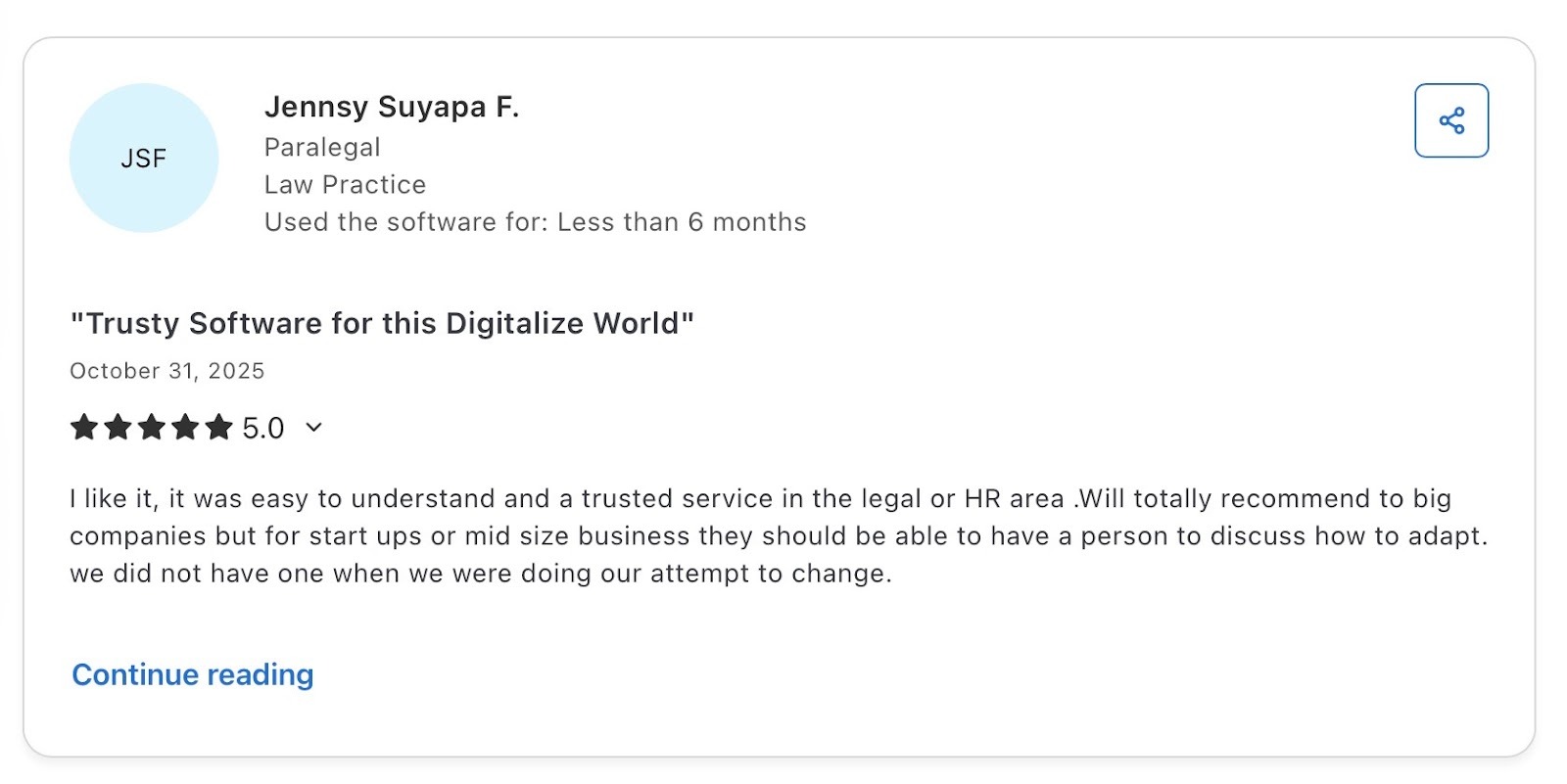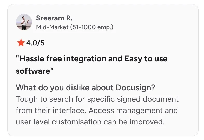 A recurring theme across G2 and Capterra is trust. Reviewers in sales, HR, and operations say that when they send a document through Docusign, recipients already know what it is and how it works.