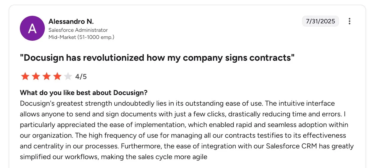 What stands out is not just day-one usability, but adoption over time. The reviewer mentions that Docusign became a central part of how contracts are handled, simply because people kept using it.