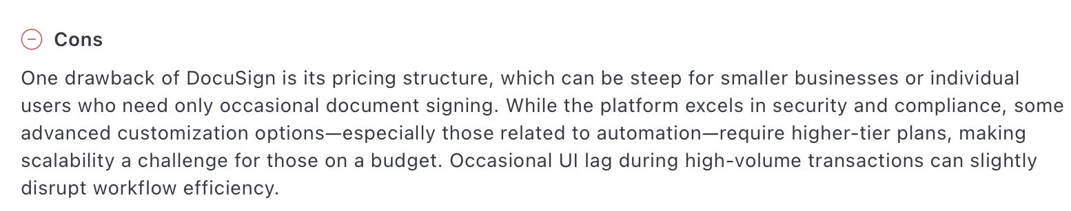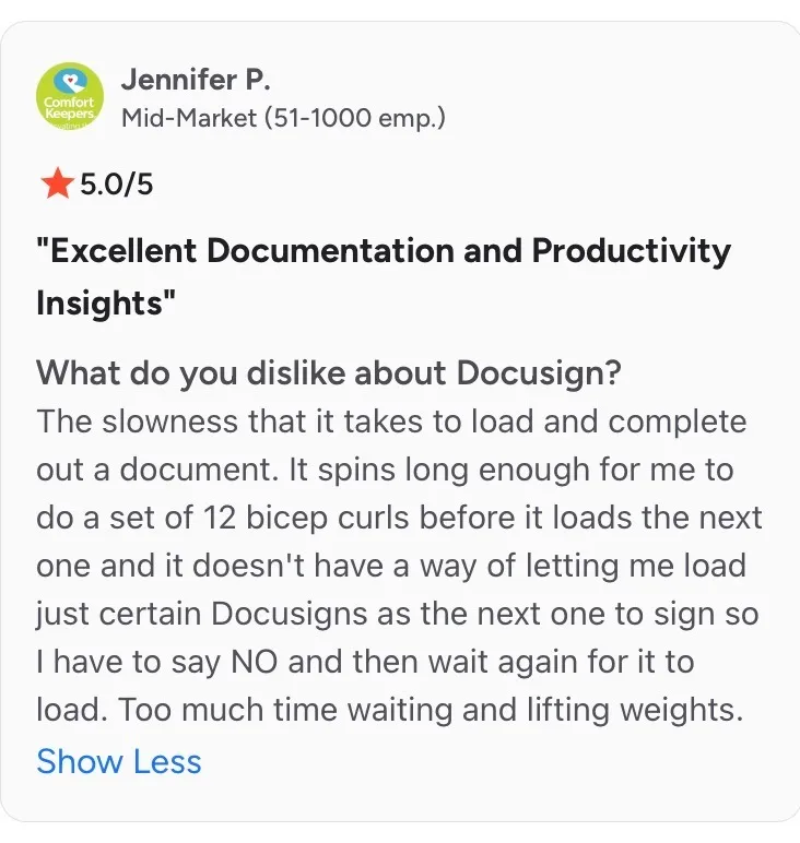 There’s also a recurring sense of mismatch. Reviewers acknowledge Docusign’s strength in security and compliance, but question whether the price still makes sense when signing needs are occasional or when teams don’t need enterprise-level depth. Add in mentions of slow support responses and occasional UI lag during high-volume use, and pricing starts feeling harder to justify.
