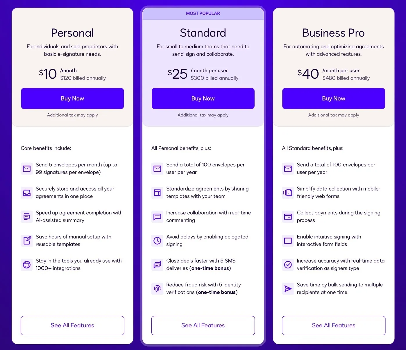 - Unlimited contracts on Business and Business Pro: Higher volume doesn’t change the bill. Teams can send as many contracts as needed without worrying about hitting a cap.