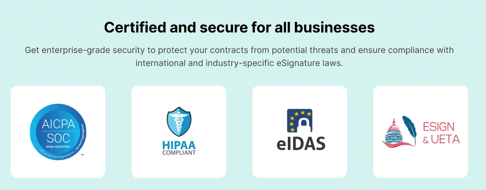 - Legal compliance: Leading eSignature solutions comply with global eSignature laws, including ESIGN, UETA, and eIDAS, providing confidence that digital signatures are legally binding and enforceable.