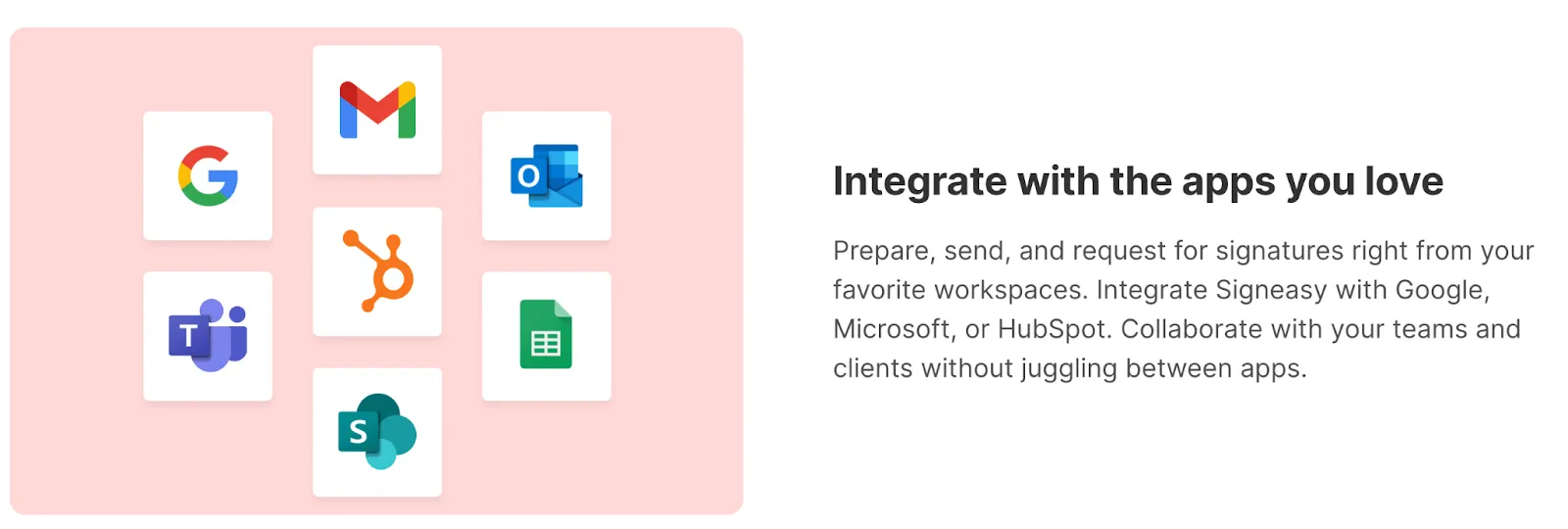 Efficiency gains come when eSignatures fit seamlessly into existing insurance workflows. Signeasy offers integrations with popular CRMs and cloud storage platforms, allowing agents and underwriters to send, track, and store signed documents without switching between tools.