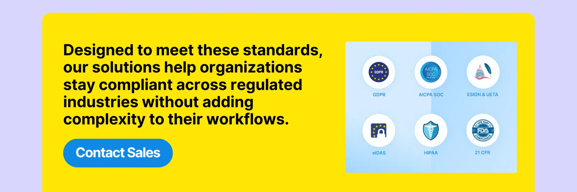 Other industries follow their own electronic signature regulations. In finance, rules from agencies like the SEC and FINRA ensure records remain verifiable and unaltered. Healthcare organizations must meet HIPAA standards that protect patient data and verify signer identity.