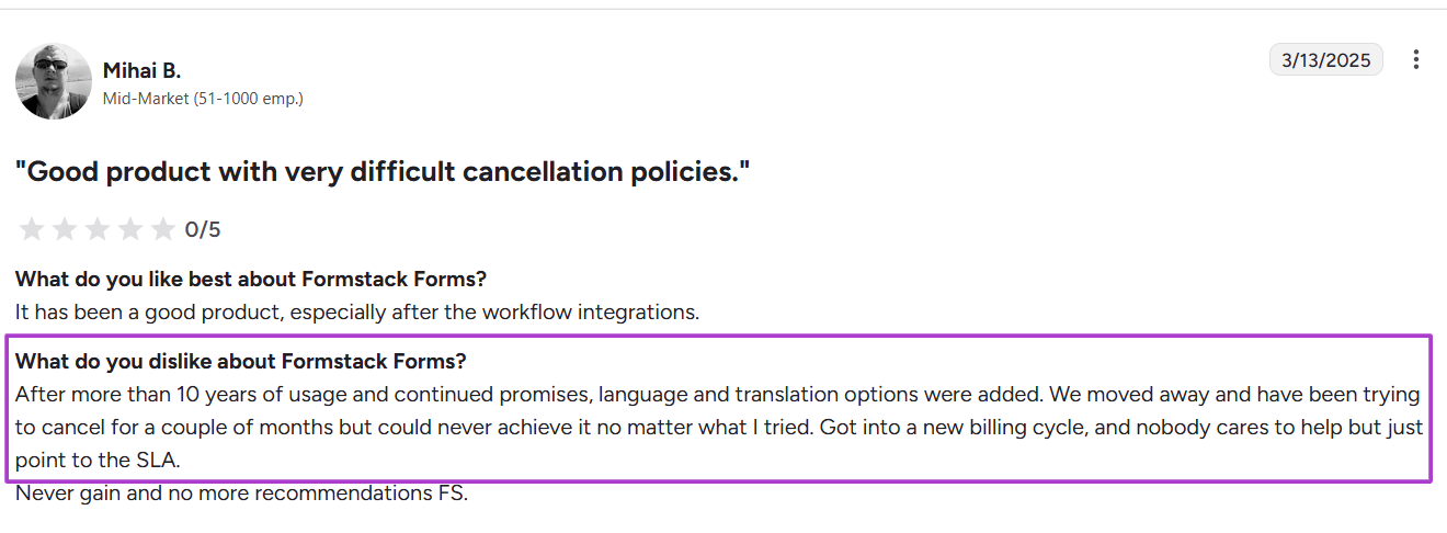 Here is a review of Formstack on G2 by a user who tried to cancel the Formstack subscription but still got into a new billing cycle:
