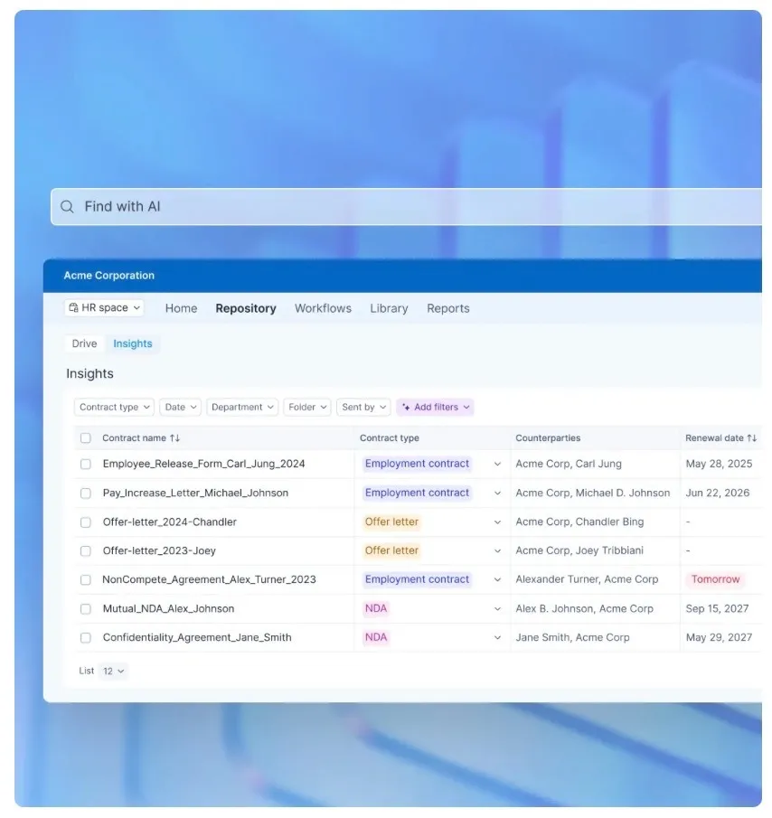 - Intelligent contract management: Keep executed agreements, amendments, and approvals organized in one searchable repository.