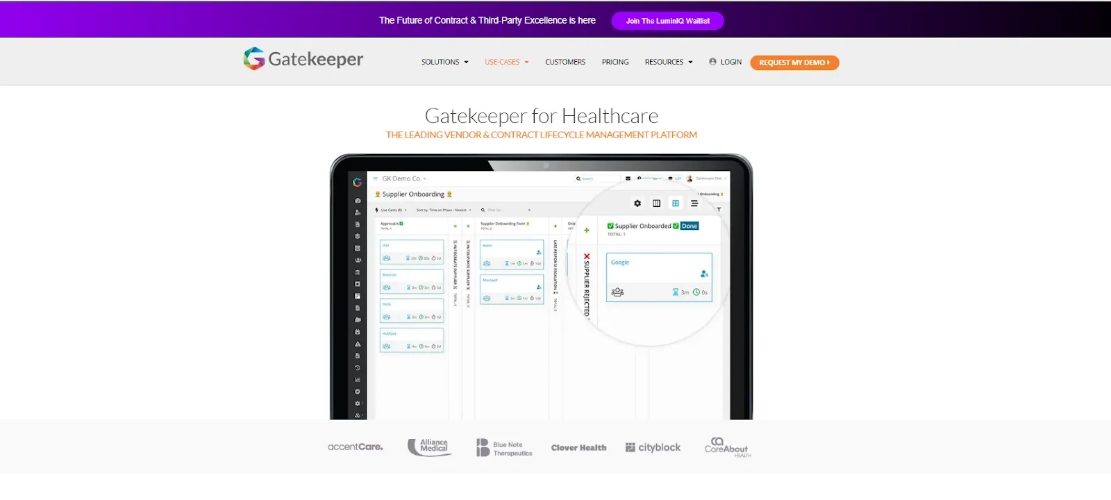 Billed annually, Gatekeeper starts at $1,245/month for 150 suppliers and contracts, $2,995/month for 500, and $5,295/month for 1,000, with all plans offering unlimited users, unlimited eSign, and professional onboarding. An Enterprise custom tier is available for large healthcare organizations needing tailored terms and integrations.
