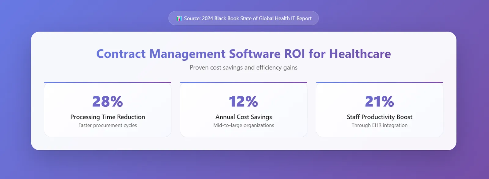 The financial benefits extend beyond reduced expenses. Integration with core healthcare systems, such as EHR platforms, has been linked to a 21% boost in staff productivity (Black Book 2024), as less time is spent searching for or verifying contract details.