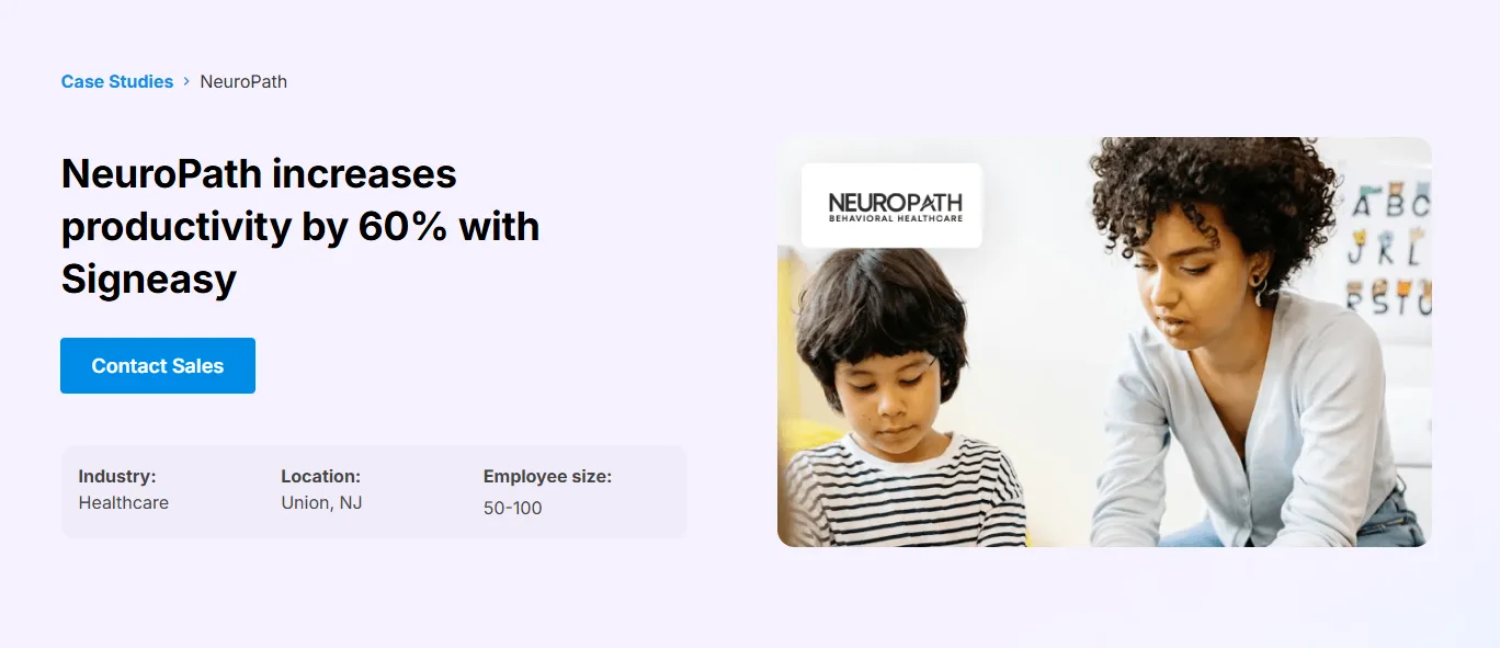 A good example is Neuropath Behavioral Healthcare, which saw a 60% productivity improvement after implementing Signeasy for all internal document management.