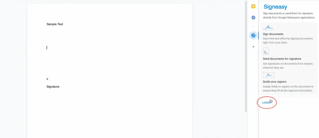 Click the icon to access the integration. Before you can use the features displayed in the sidebar, you’ll need to log into your Signeasy account and give us permission to access your documents. If you don't have an account yet, now is the time to create one!