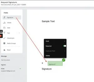 In this scenario, we’re going to add some fields. When you click the green button, Signeasy will populate your document. Using the left-hand toolbar, you will be able to add fields to help guide your signer(s) through the document. In this case, we are going to show the signer where their signature is needed.
