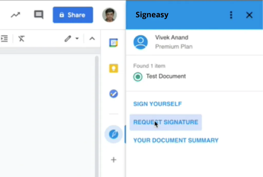 Now, thanks to our latest integration, you can turn this highly collaborative environment into a full-service hub for creating, signing, and finalizing agreements. Signeasy for Google Docs allows you to request signatures and sign documents yourself without having to download, upload, or export a single file.