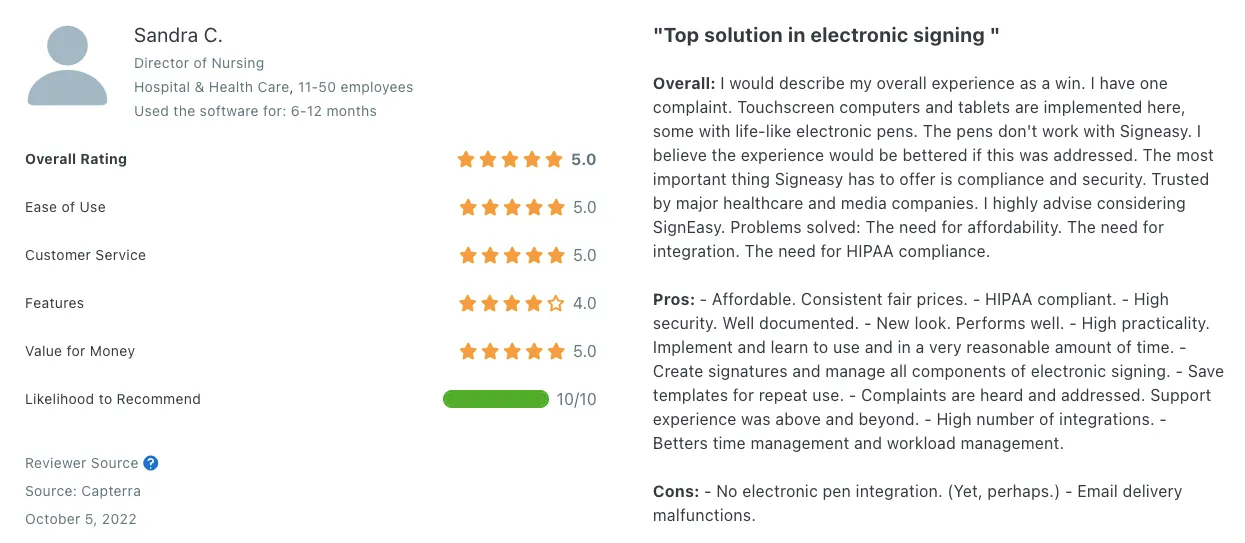 Signeasy is recognized as one of the top 10 HIPAA-compliant eSignature solutions, and for good reason. Its robust security features, user-friendly interface, and commitment to regulatory compliance make it a trusted choice for healthcare organizations. The platform's extensive integration capabilities allow seamless incorporation with various business applications, such as CRM systems and cloud storage services, and also support smooth docusign migration for organizations transitioning from other eSignature tools.