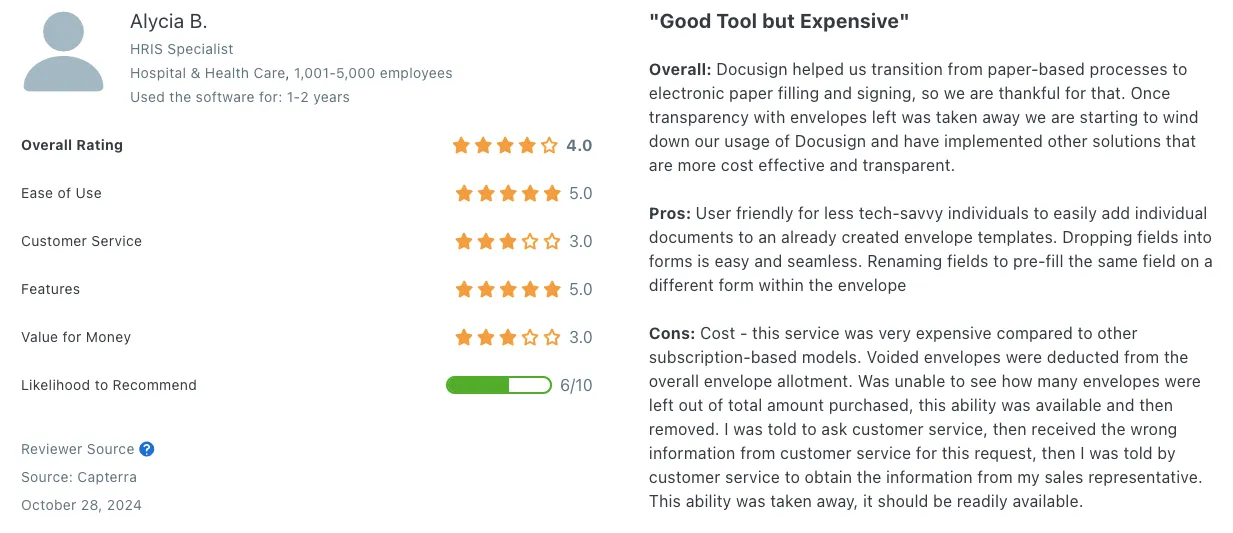 - Compliance: Docusign is certified to meet HIPAA requirements and complies with other global security standards such as ISO 27001 and SOC 2 Type II.