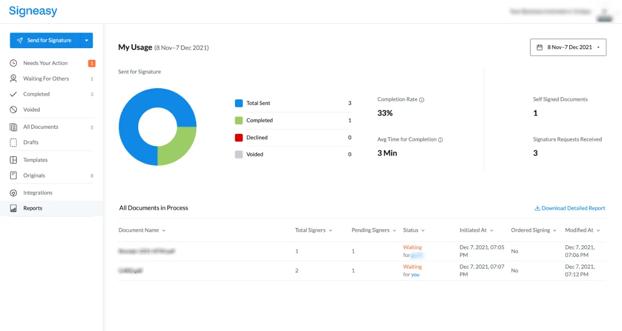 Ever wonder how many documents your team sent out for signatures, how many of those got signed/ declined, and how many are stuck in pending status? This information is just a click away with Signeasy. You can also know whether the eSignature tool makes your business processes faster and more efficient by comparing the change in document completion rate on a month-on-month basis.
