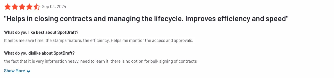 Unlike Ironclad, which offers a basic Microsoft Word experience, Spotdraft features a custom editor that seamlessly integrates with Word. Additionally, Spotdraft's onboarding process is significantly quicker.