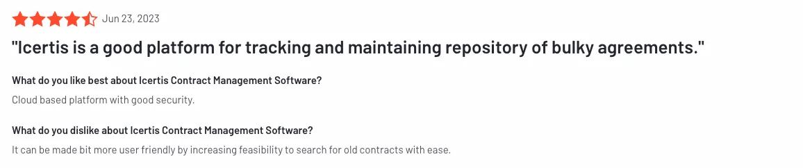 Icertis is perfect for companies that handle massive volumes of contracts. It also includes various compliance management measures for regulated industries ensuring adherence to multiple requirements during the contract lifecycle.