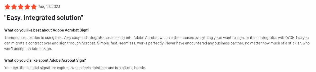 Adobe Sign is known for having a smooth cloud-based system that lets users sign documents without signing onto the platform, and where teams can automatically save everything onto Adobe.