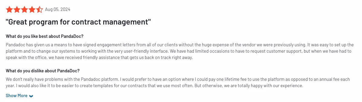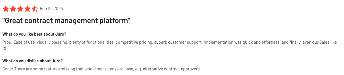 Such costs are significantly higher when compared to simpler contract management tools like Signeasy, Docusign, or Juro, which are more accessible to fast growing businesses.