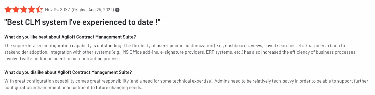 - Teams typically require a dedicated IT person to configure and maintain Agiloft