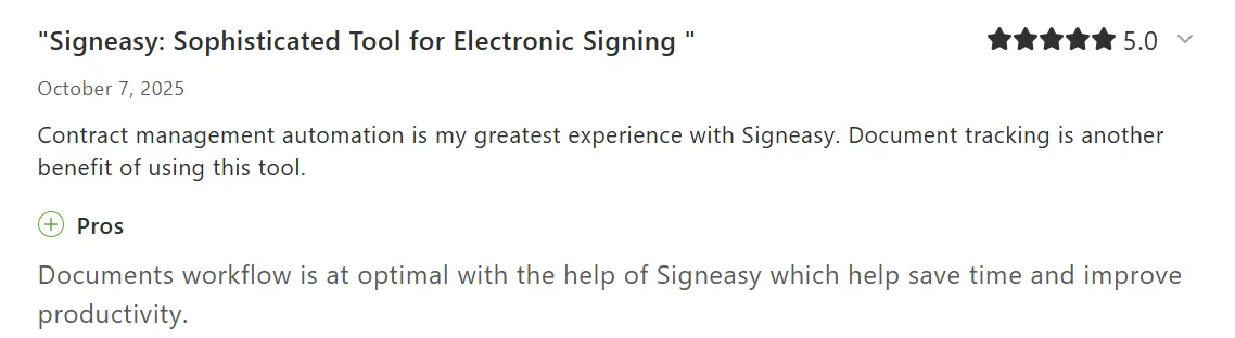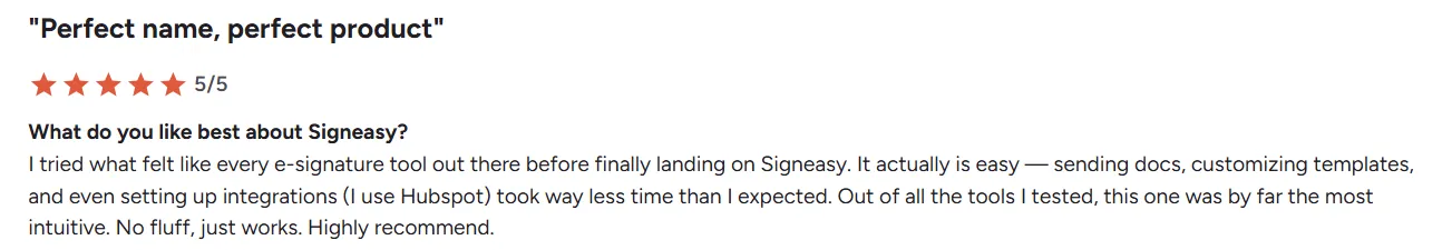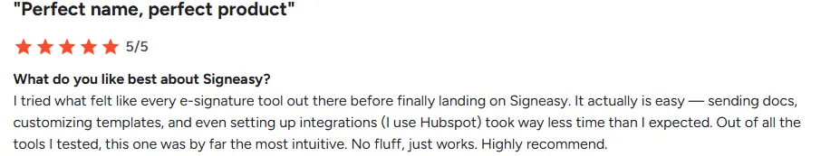 From a recent G2 review: “What I like best about Signeasy is its simplicity and user-friendly interface. It makes signing and managing documents incredibly easy, whether I'm on my phone or desktop.”
