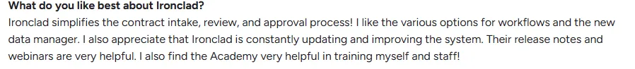 35 users on G2 highlight the ease of use and how it streamlines contract workflows, automates approvals, and ensures compliance. A specific review also talks about how Ironclad’s academy and webinars help contract managers train their staff.